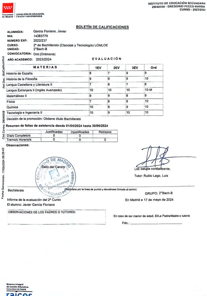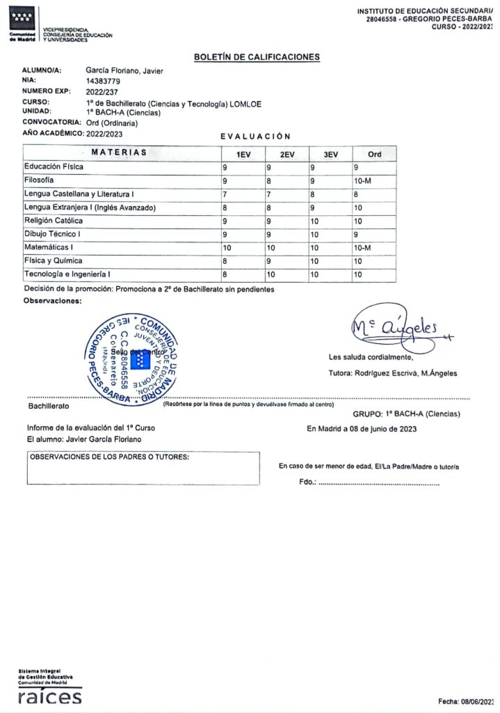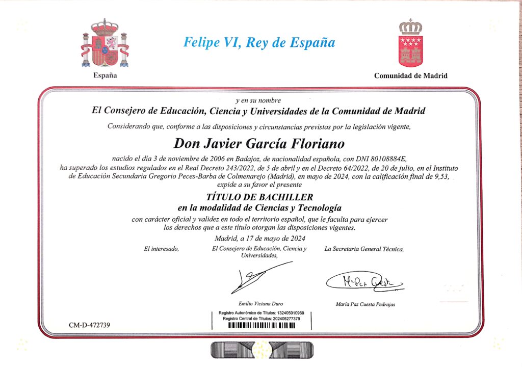 I obtained a final grade of 9.5 /10. Awarding me an honors distinction by Comunidad de Madrid.