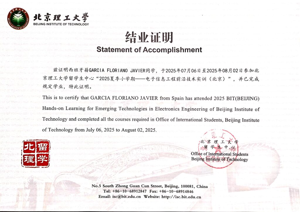 After a rigorous application process involving a motivational letter and my CV, I was honored to be selected by UPM (Universidad Politécnica de Madrid) and subsequently accepted into the Beijing Institute of Technology (BIT) summer program, with a full scholarship covering all fees and accommodation costs.